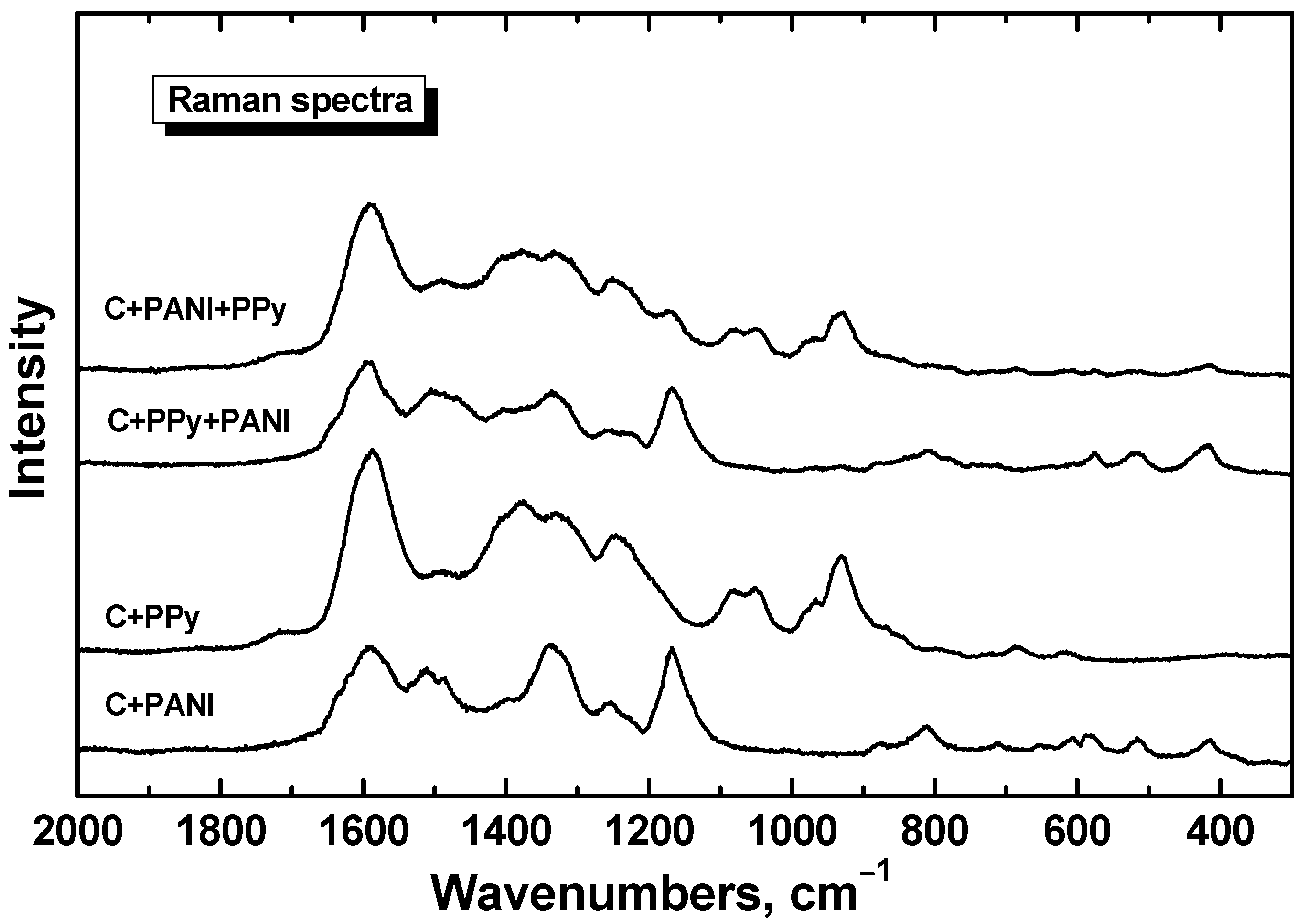 - Trchová, M.; Morávková, Z.; Bláha, M.; Stejskal, J. Raman spectroscopy of polyaniline and oligoaniline thin films. Electrochim. Acta 2014, 122, 28–38. [Google Scholar] [CrossRef]