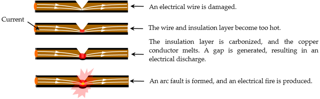 What is an arc fault? According to the Underwriters Laboratories (UL) Standard UL 1699, arcing is defined as a luminous electrical discharge across an insulating medium, and the partial volatilization of the electrodes is usually accompanied by the arcing process. An arc fault is defined as an unintended arcing situation in a circuit []. However, visible sparks, or arcs, naturally generated in relays and brush motors are different from arc faults. Such sparks are arcs generated under normal operation and are considered to be non-hazardous in terms of fire detection. Arc faults are generated in circuits for many reasons. Typical causes include electrical cords or wires having loose connections; worn insulation on electrical cords or wires resulting from corrosion, age, bending stress or heat; and damaged or misapplied electrical equipment. Figure 1 shows a process of an electrical fire caused by an arc fault. The insulating material layer of the damaged electrical wire is carbonized, and sporadic arcs are subsequently generated. Over time, the carbonized paths are further expanded, and severe arcs are formed. These arcs can release a tremendous amount of energy and can reach temperatures of up to 13,000 K []. If combustible materials are nearby, a fire will easily be produced [,].