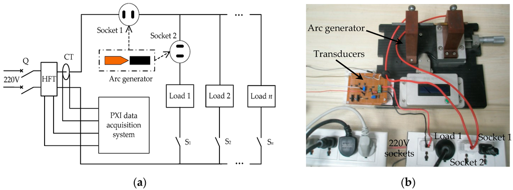 As reported by the United States Fire Administration (USFA), there were an estimated 372,900 residential building fires in the United States each year from 2011 to 2013, causing an estimated 13,125 injuries, 2530 deaths and $7 billion in property damage []. Fires represent a serious threat to humans. Electrical fires are one of the most frequently occurring types of fires, representing on average up to 30.2% of all fires and exceeding 50% of all large fires [,]. Statistical data from fire administrations show that electrical fires are usually caused by arc faults, over currents, short circuits, leakages [,,,,,], etc. After the USFA studied the sources of heat in residential building electrical fires, they stated that arc fault accounted for 82% of the electrical fires []. Specifically, arc faults represent one of the most important causes of electrical fires [,,]. Traditional fire detection technologies usually monitor smoke, gas, temperature, etc. Recently, several fire feature signals could be detected by multisensors []. The multi-wavelength LiDAR technique was applied to study the smoke of a fire []. A laser spectroscopic carbon monoxide sensor was used to detect fires []. Some wireless sensors and intelligent technologies were introduced for fire identification [,,]. These technologies typically detect fires after they have occurred. Various advanced early detection methods may be able to effectively reduce fire losses and the number of false alarms. Early detection technologies can protect electrical equipment and humans before fires occur. Consequently, the development of advanced early detection technologies for reducing the occurrence of electrical fires caused by arc faults represents an urgent task.