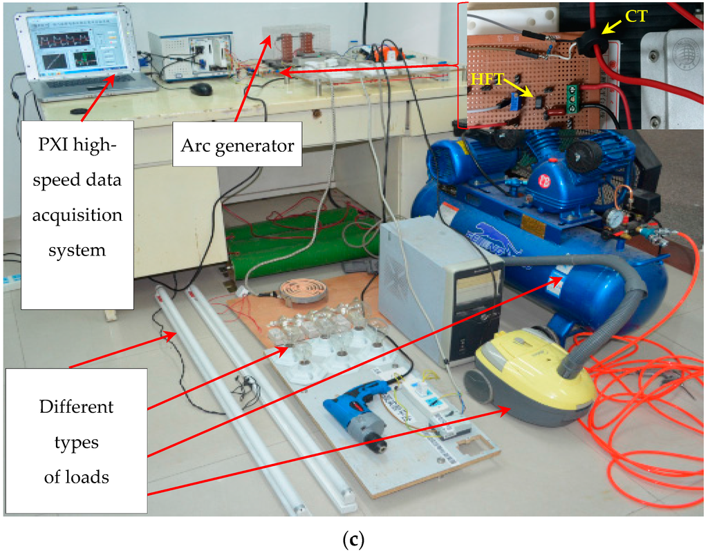 Line currents, which are easily measured in circuits, have been used to study arc fault features in many studies. Many high-frequency components have been found in the currents of arc faults, the frequency bands of which are usually wide [,]. The spectral energy of currents has been calculated to discriminate arc faults from load states []. Some arc fault detection algorithms have been implemented in microcontrollers [,], and various patents for arc fault detection devices have been approved [,,,]. However, the accuracies of many detection devices have not been high []. Because arc fault features are always hidden in the line currents, many advanced methods have been used to extract them. A Kalman filtering algorithm, artificial neural networks and fuzzy logic algorithms have been separately used to classify arc faults and normal states [,,]. The harmonic components of arc fault currents have been analyzed [,]. The reconstructed information entropy of each current frequency band has been calculated to obtain the feature frequency bands of arc faults []. Arc fault currents have been decomposed based on the discrete wavelet transform (DWT), where the wavelet transform coefficients were used as fault features []. In one study, currents were first de-noised by DWT to improve the signal-to-noise ratio, and the current eigenvectors were then trained through wavelet networks to detect arc faults []. The Gabor Transform (GT) has been used to obtain an optimal feature extraction; the extracted GT coefficients of currents were used to identify arc faults [].