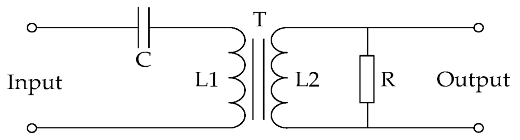 The arc generator includes a moving electrode and a stationary electrode, as shown in Figure 3. One electrode is a carbon-graphite rod 6.4 mm in diameter, and the other electrode is a copper rod. The arc generator is used to generate arc faults in circuits. The transducers consist of a high-frequency transducer (HFT) and a current transducer (CT), as shown in Figure 2c. A schematic of the HFT is shown in Figure 4. The input and output terminals of the transducer are connected to the power supply terminals of the loads and data acquisition system, respectively. A transducer CT210 is selected as the CT. A PXI-5124 digitizer fixed in PXIe-1071 is used for high-speed data acquisition, and the sample rate is set as 125 MS/s. As shown in Figure 4, the high-frequency signals in the power supply circuit are coupled by a capacitor C and a transformer T. A high-pass filter composed of a capacitor C and the primary coil L1 of T is used. The power frequency signals at 50 Hz will be first filtered by the high pass filter. According to the principle of electromagnetic induction, many high-frequency current signals will be generated in the secondary coil L2. Then, the high-frequency voltage signals will be generated in a resistor R. Finally, they will be collected by the PXI-5124 digitizer. The transformer T is used as an isolated unit between the strong electricity signal and the weak electricity signal. Both arc faults and normal states of typical loads can be realized using the experimental platform. Large quantities of high-frequency signals and currents in different load states are collected to study the common features of arc faults in the next section.