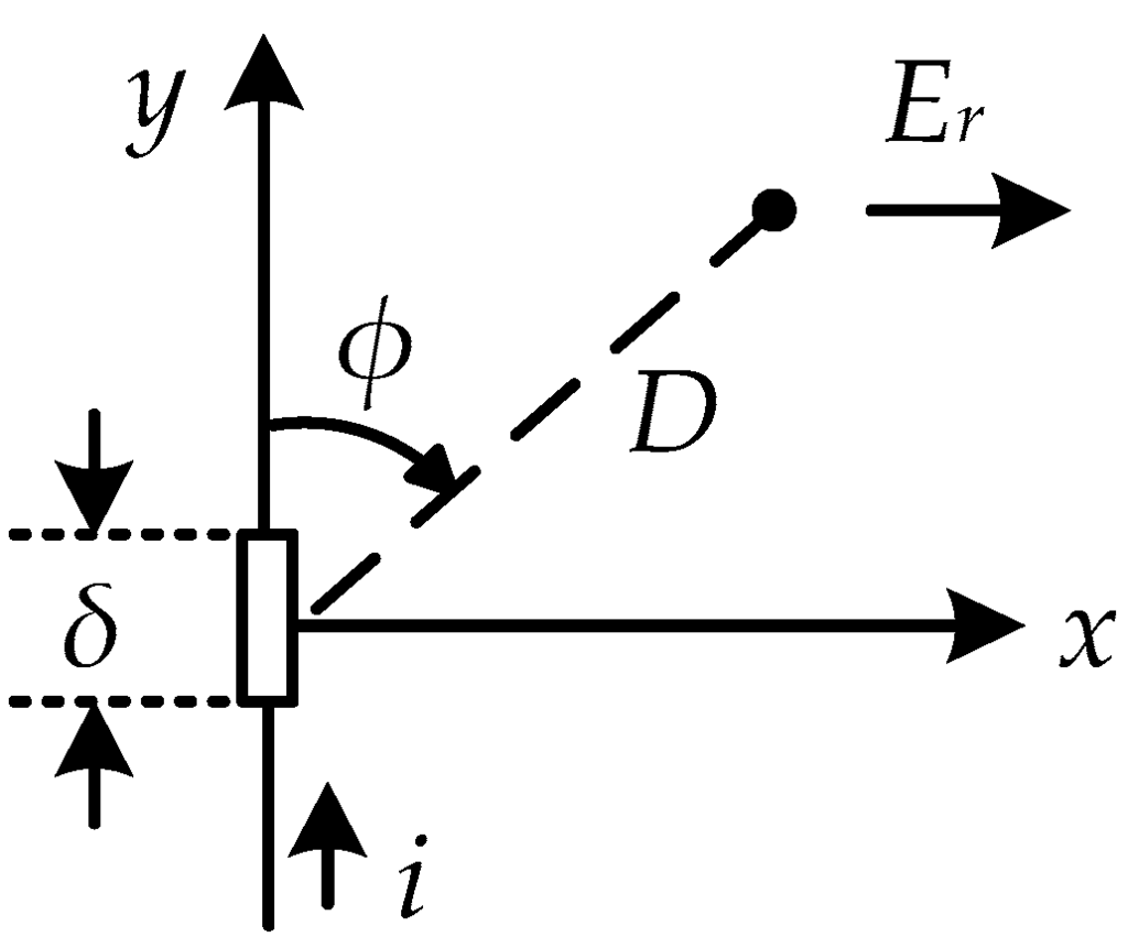 where D is the distance from the component, t is time, is the angle with the y-axis, is the vacuum permittivity, c is the speed of light, and is the length of the current component []. For a spot arc, the length is negligible; therefore, Equation (1) can be simplified as: