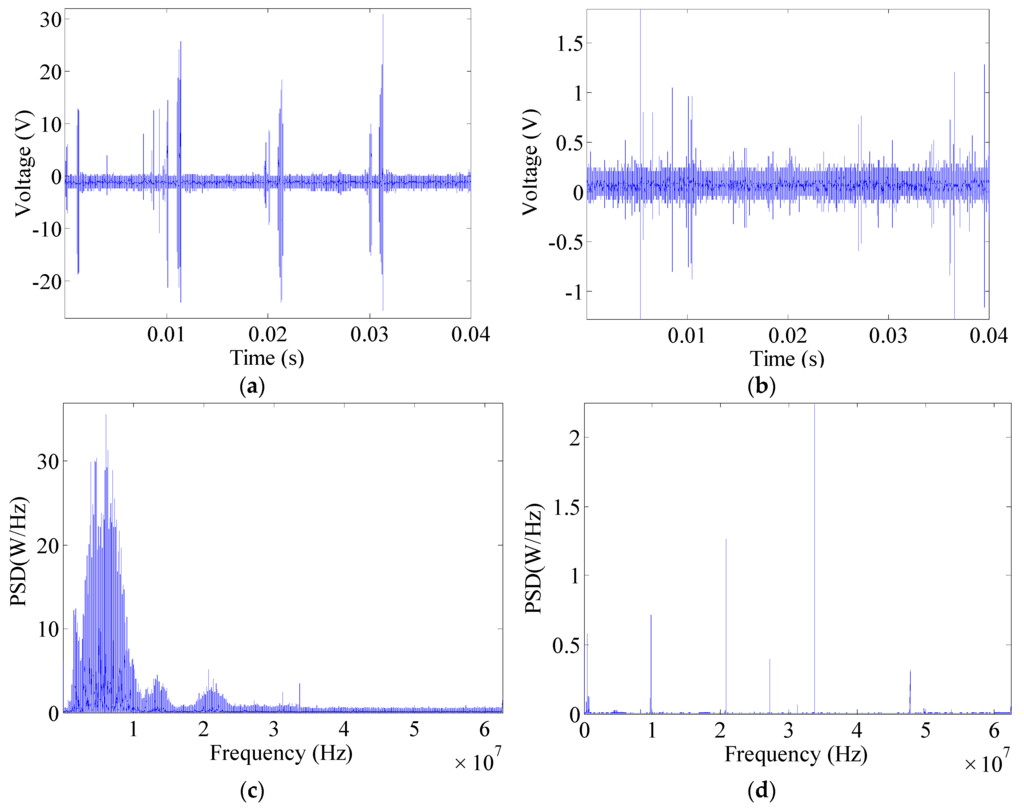 An electrical drill’s high-frequency signals and corresponding power spectral density (PSD) are shown in Figure 6. The high-frequency signals of arc faults are densely distributed and exhibit large amplitudes. Various frequency bands with large amplitudes can also be found in the power spectrum. However, when an electrical drill is operated in the normal state, random interference pulses are generated in circuits. The pulses are caused by a brush motor in the electrical drill. Electrical discharges are usually accompanied by friction between the brush and rotor. Electrical sparks are easily observed from the electrical drill’s windows. These sparks are load arcs and are not hazardous. Interference generated by these sparks should be overcome in arc fault detection. Therefore, the varied regularities of spectra over time will help facilitate further analysis.
