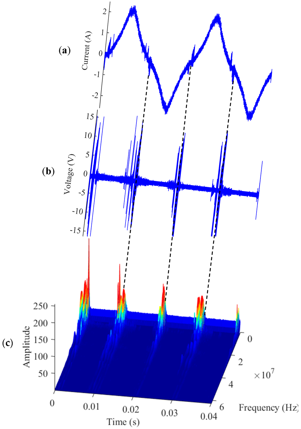 Because arc faults are non-stationary, their frequency spectra and power spectra are usually time variant. To further research the features of arc faults in different time and frequency bands, STFT is introduced. The arc fault signals’ STFT for the electrical drill is shown in Figure 7. The high-frequency signals of the arc faults can be found in both the line current and phase voltage, and they are generated periodically following the current cycles, as shown in Figure 7a,b. They clearly change in a wide frequency band, especially under 30 MHz, as shown in Figure 7c.
