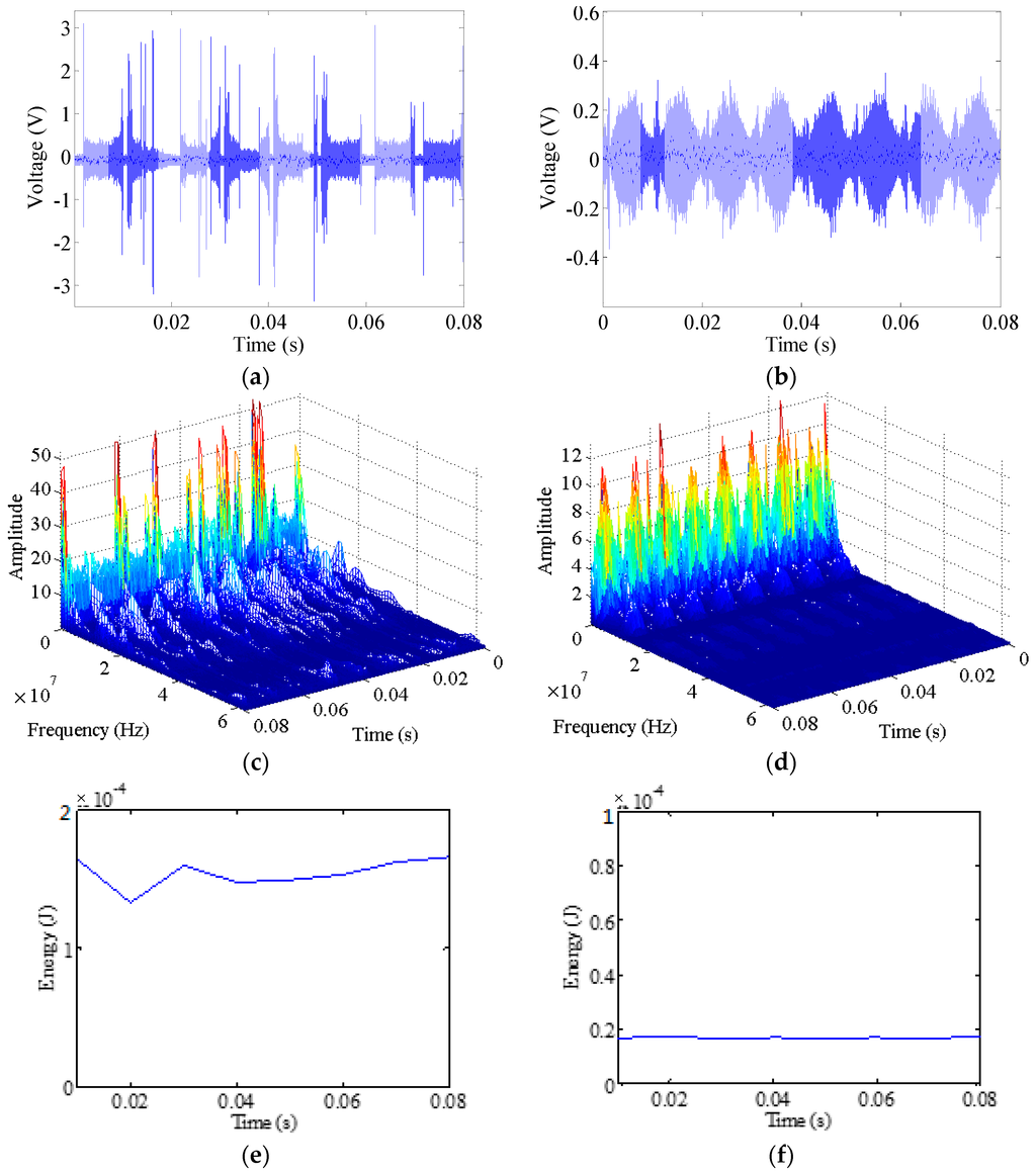 Signal analysis of a vacuum cleaner: (a) high-frequency signals of arc faults; (b) high-frequency signals under normal operation; (c) signals’ STFT of arc fault signals; (d) signals’ STFT under normal operation; (e) high-frequency energy of arc faults; (f) high-frequency energy under normal operation.