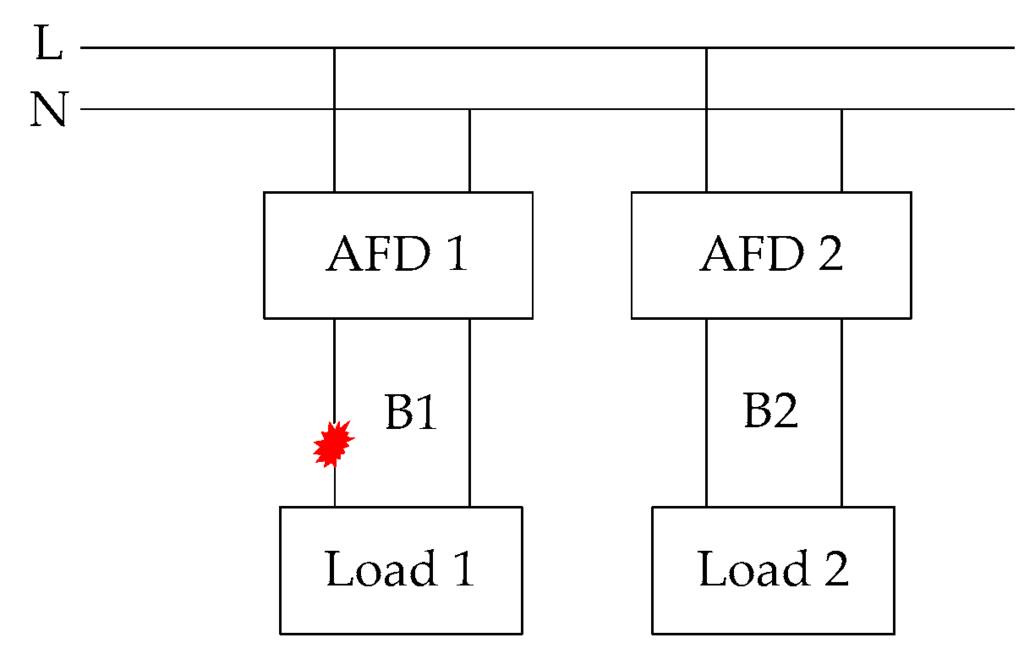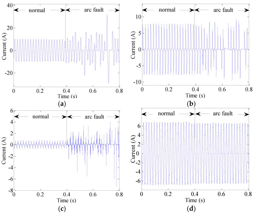 Arc faults are categorized into three types: series arc faults, parallel arc faults and ground arc faults. As a result of the existence of fault arc impedance, the currents of series arc faults are usually lower than the rated currents of loads, and the currents of parallel and ground arc faults are usually lower than those of short circuits. The arc fault currents are not sufficient to trigger traditional protection devices such as overcurrent protectors and ground fault circuit interrupters. Therefore, these protection devices cannot be used to protect circuits from arc faults []. Moreover, arc faults are often latent, intermittent and transient; thus, one should monitor circuit states in real-time to detect such faults to prevent electrical fires. Hence, an arc fault detector (AFD) represents an urgent need in electrical fire detection.