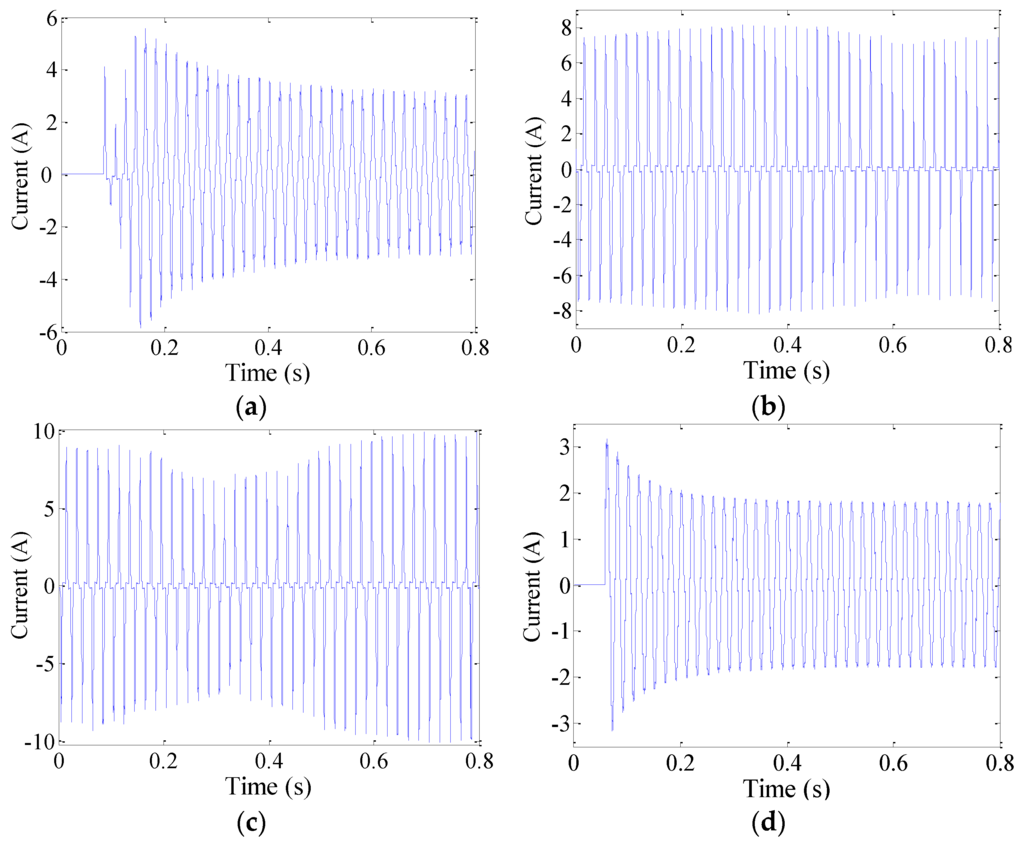 Currents of transient processes: (a) starting an electrical drill; (b) dimming lamps; (c) regulating the speed of a vacuum cleaner; (d) plugging in a halogen lamp.