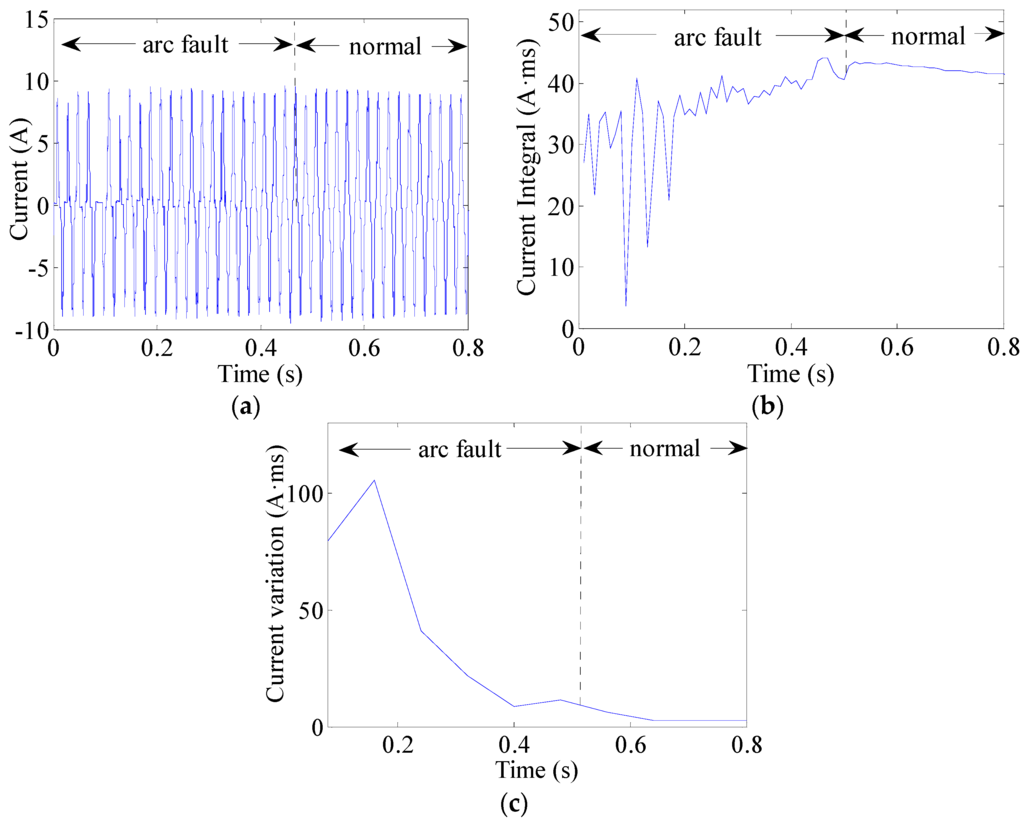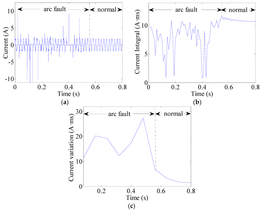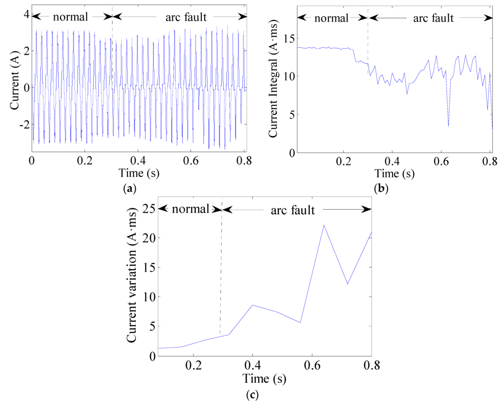 - The line currents of arc faults are often distorted or become unstable; however, current periodic integrals also clearly change under normal states, especially during transient processes.