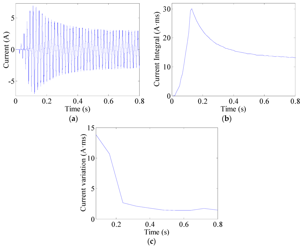 Arc fault current analysis of the electrical drill: (a) current waves; (b) current periodic integrals; (c) current variations.