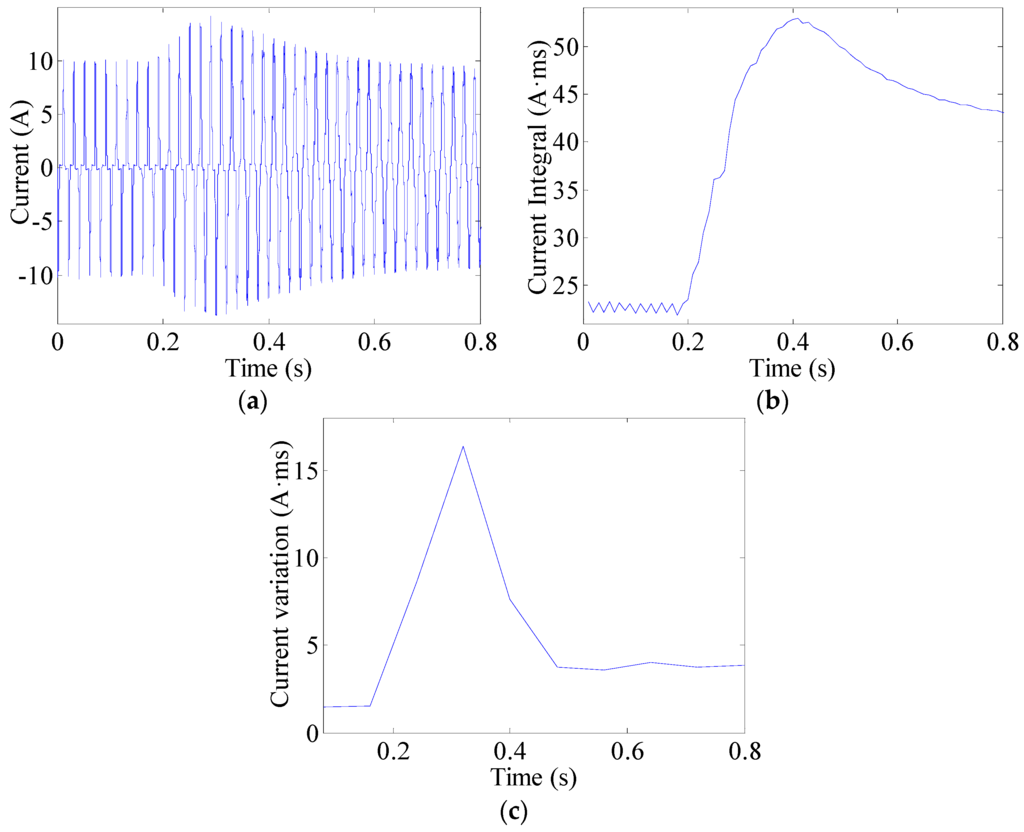Arc fault current analysis of the vacuum cleaner: (a) current waves; (b) current periodic integrals; (c) current variations.