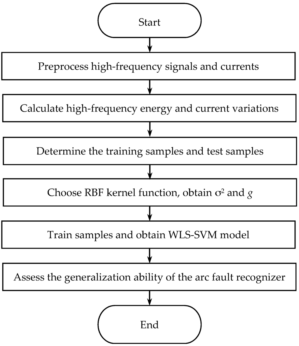 - High-frequency signal energy and current variations were extracted as the input eigenvector of the arc fault detection algorithm. An algorithm based on WLS-SVM was designed to identify arc faults from load states.