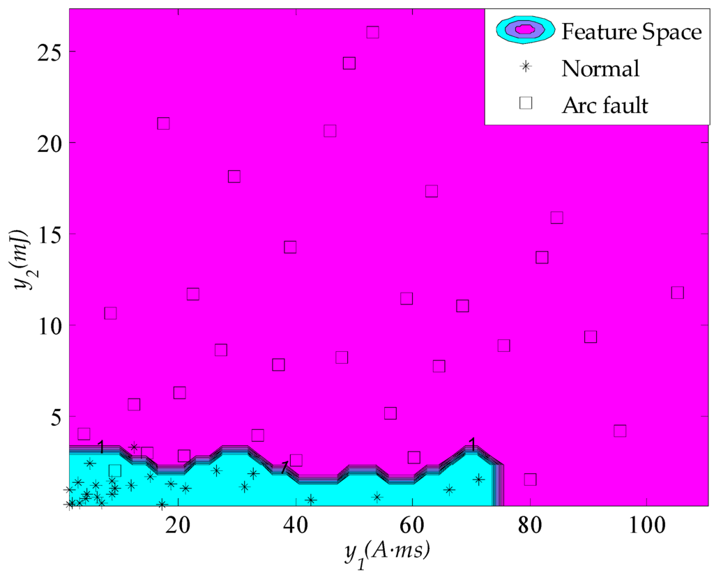 A nonlinear function f(y) is used to map the eigenvector y from the observation space to a higher dimensional feature space. The optimal identification between arc faults and normal states can be obtained in the higher dimensional feature space. The constrained optimization problem can be described as [,]: