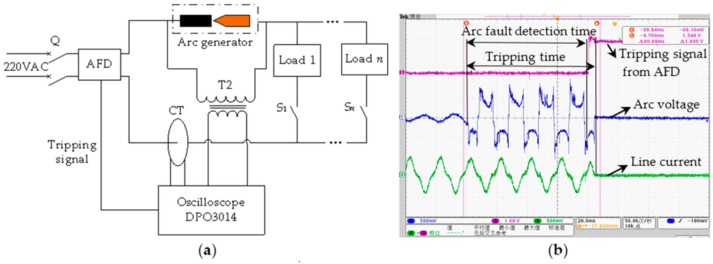 According to various standards, including IEC 62606: 2013 and GB/T 31143-2014, numerous test experiments were performed to verify the detection effects under different loads. The schematic of the tripping test is shown in Figure 21a. The fault arc voltage, the line current and the tripping signal from the AFD were observed using a Tektronix DPO3014 oscilloscope, as shown in Figure 21b, and the tripping time of the AFD was 84 ms. The experimental schematic of cross talk is shown in Figure 10. When arc faults occurred in branch B1, AFD 1 could detect them in a timely manner and interrupt the circuit power supply before an electrical fire was produced to ensure the prevention of electrical fires. Moreover, AFD 2 did not alarm or trip. This is because the current variation was added as an important feature in the arc fault detection algorithm. The power frequency currents at 50 Hz are not easily influenced by cross talk. Therefore, the developed AFD can overcome the influences of cross talk and transient processes.