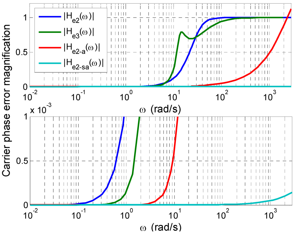 - Except for the frequency range of 6.7 < ω < 28.6 (rad/s), the unaided third-order PLL shows better dynamic performance than the unaided second-order PLL.
