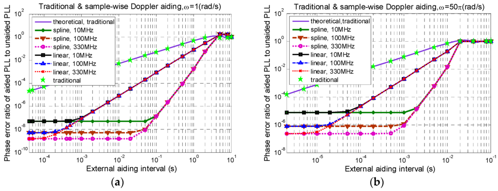 - When Ta begins to decrease from its upper threshold , sample-wise aiding with linear interpolation shows better tracking performance than traditional aiding, yet its improvement cannot catch up with the spline interpolation, until that reaches a certain lower threshold, denoted by . When , the ratio of the phase error amplitudes of sample-wisely aided PLL to unaided PLL will be only determined by the theoretical limit , independent of , and cannot be improved by employing other more advanced interpolation techniques. In addition, before reaching the lower threshold, there is a middle threshold of Ta, such that for the region, the improvement effect of sample-wisely aided PLL to unaided PLL is only determined by and the interpolation method, independent of , and can be improved by employing other more advanced interpolation techniques.