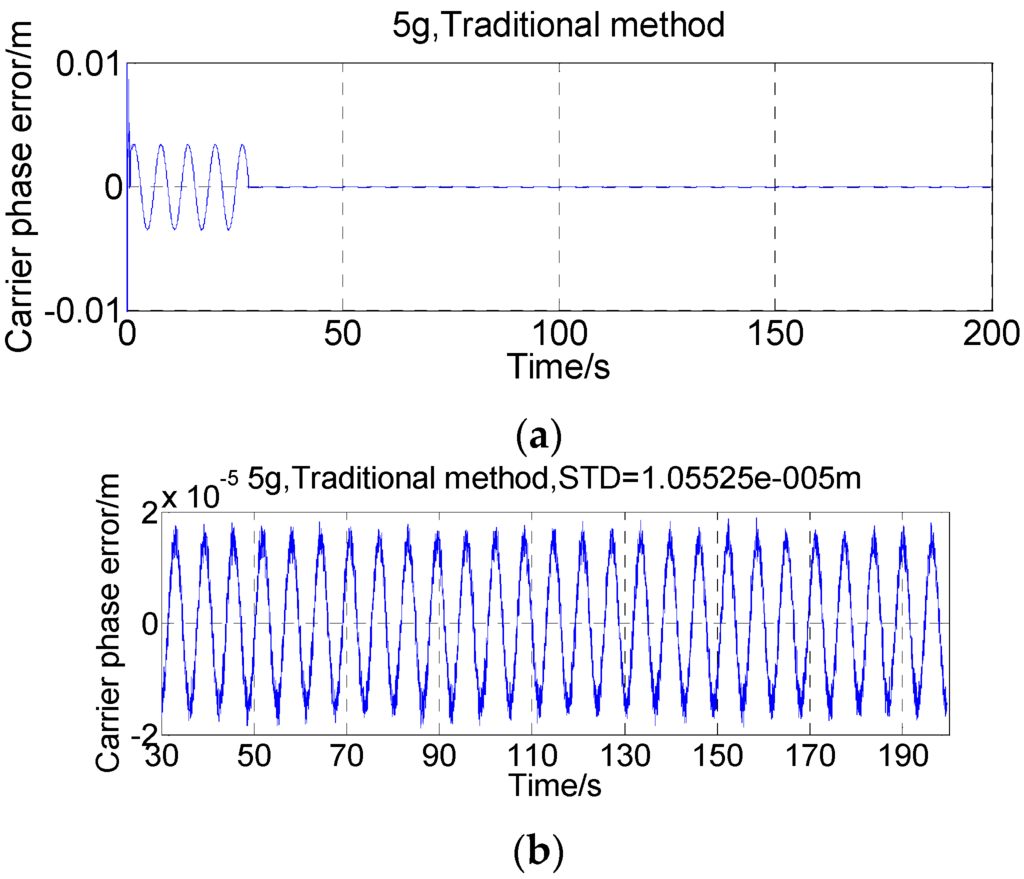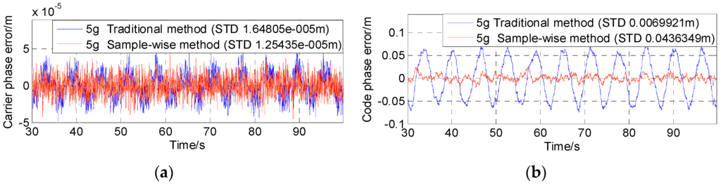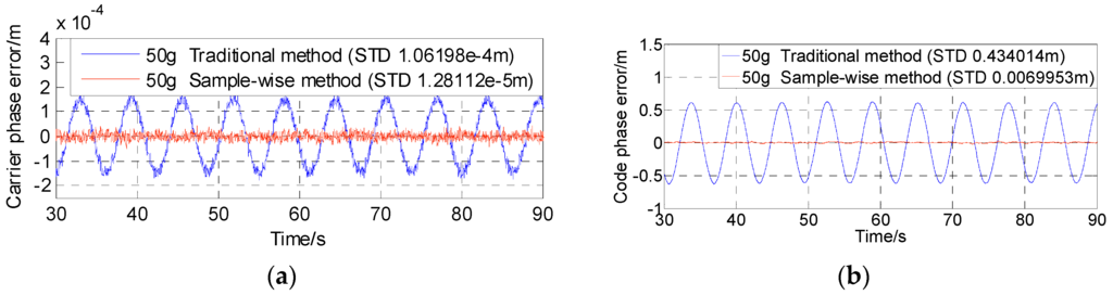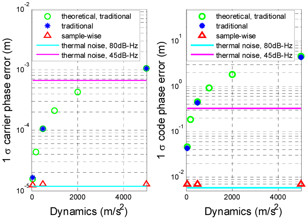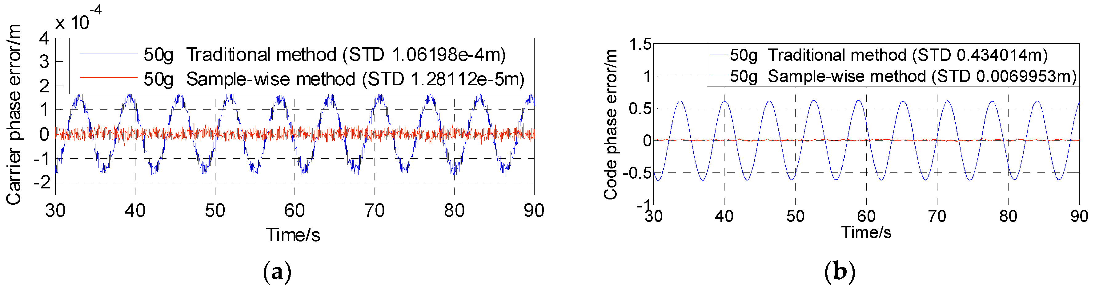 4.3. Aiding Effects on Code/Carrier Phase Errors with a C/N0 of 80 dB-Hz