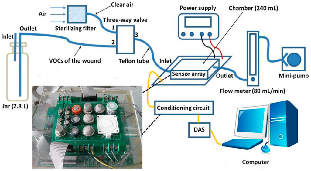 The sensor array in the research is constructed due to the high sensitivity and quick response of the sensors to the metabolites of three different bacteria. The E-nose system consists of 15 sensors: Fourteen metal oxide gas sensors (TGS800, TGS813, TGS816, TGS822, TGS825, TGS826, TGS2600, TGS2602, TGS2620, WSP2111, MQ135, MQ138, QS-01 and SP3S-AQ2) and one electrochemical sensor (AQ sensor). A 14-bit data acquisition system (DAS) is used as interface between the sensor array and a computer. The DAS converts analog signals from sensor array into digital signals which are stored in the computer for further processing.