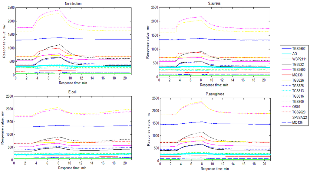 Four groups of mice were tested in the research, including one control group and three groups infected by Staphylococcu aureus, Escherichia coli and Pseudomonas aeruginosa, respectively. Twenty tests for each groups of mice in the same conditions were made, and finally 80 samples for all four groups of mice were collected from the above procedures. Figure 2 illustrates the sensor responses process when they are exposed to four different target wounds, where X-axis is the response time of the sensors and Y-axis is the output voltage of the sensors.