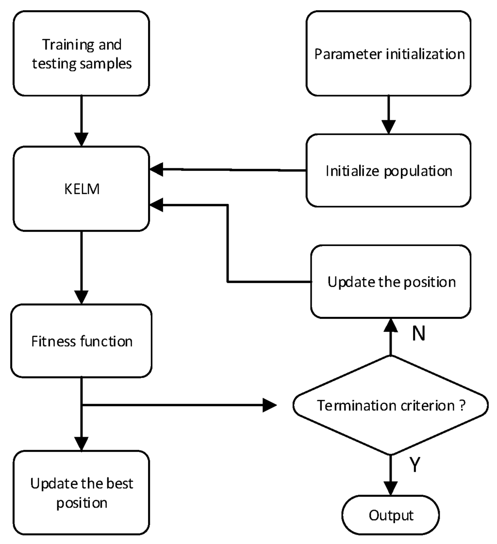 It is well known that the parameters in algorithms will affect the performances. Therefore, QPSO [46] is used to optimize the value of C in Equation (10) and parameters of the kernel function. The dimension of searching space is corresponding to the number of parameters of KELM with different kernel functions, and the position of each particle represents the parameter values of kernel functions. Because the best generalization performance of KELM can be optimized by QPSO, the testing accuracy can be used as the fitness function of QPSO. The specific steps of QPSO-KELM are described as follows.
