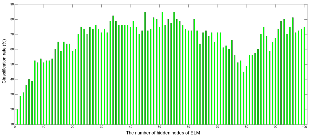 Figure 4 and Figure 5 show the variation of the classification rate with the number of hidden nodes in the hidden layer of ELM and the k value of KNN for the priority to classification of wavelet coefficients feature. Figure 4 shows only the classification results of one of the 100 repeated experiments to display the change process with the number of hidden nodes in the hidden layer varying from 1 to 100. It can be clearly seen that the classification rate gradually improves with the number of hidden nodes from 1 to 34 and from 79 to 96 from the Figure 4, while the classification rate gradually declines with the number of hidden nodes from 55 to 79. Moreover, ELM can achieve the best classification accuracy of 85% when is the number of hidden nodes are 45, 51 and 55.