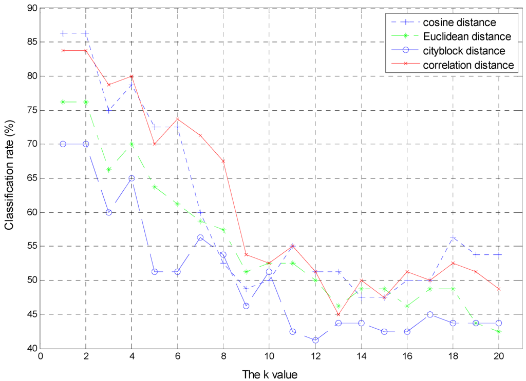 Figure 5 manifests that the classification rate gradually declines as the k value increases on the whole. For different distance metrics, the cityblock distance performs worst except k = 8, 10, 20. Meanwhile, the cosine distance can achieve the best classification accuracy of 86.25% at the start stage and performs best as well at the last stage.