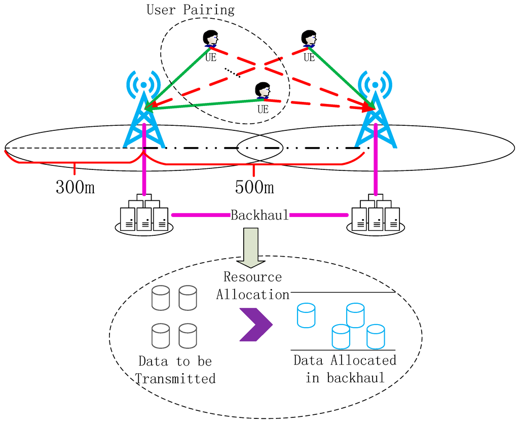 First of all, we evaluate the performance of our algorithm on the MATLAB platform. The distance between two BSs is 500 m. The radius of each cell is 300 m, which is illustrated in Figure 2. In the uplink scenario, users are transmitting signals to both of the base stations and signals are also interference to an adjacent base station. Two base stations are connected using the backhaul link. User pairing is proposed in coordinated demodulation of the received signal and the resource allocation in backhaul link is proposed to make full use of the system. During each timeslot, there are eight users transmitting simultaneously via eight subcarriers in each cell and their positions are randomly generated. Wireless channel taken in our simulation is multipath Rayleigh fading with pass loss exponent and 8 paths with power [1 0 0 2.0053 0 0 0 1.2646] in dB. We have evaluated the sum rate of users in both cells achieved by our algorithm under different backhaul resource.