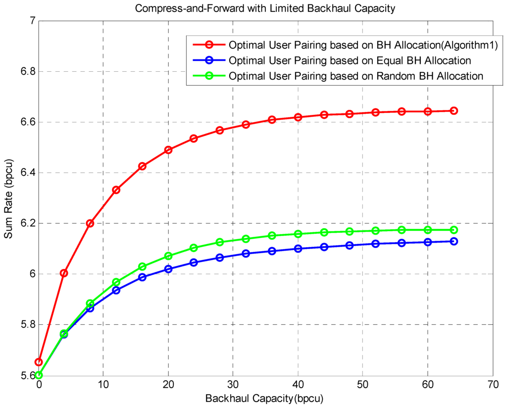 These three curves have a common tendency. As the backhaul resource grows, the sum rate at first increases approximately linearly, and then it rises slowly, and finally, it enters into a stable stage. This is because in this low backhaul resource region, system capacity is limited by backhaul resources rather than additional information BS B can offer. In other words, the upper cut set bound is dominant. However, at the high backhaul resource region (larger than 60 bpcu as depicted in the figure), the additional information offered by BS B becomes the limiting factor. That is the upper multiple access channel bound is dominant. In this region, the sum rate is saturated.