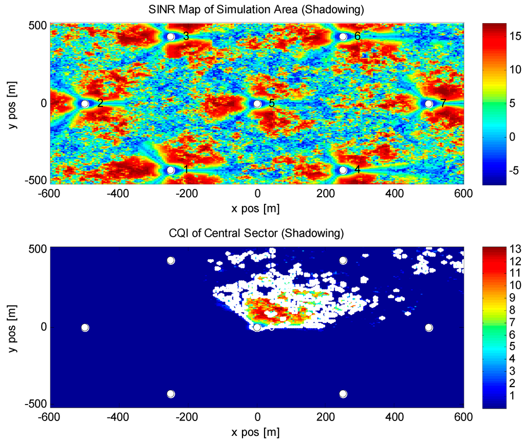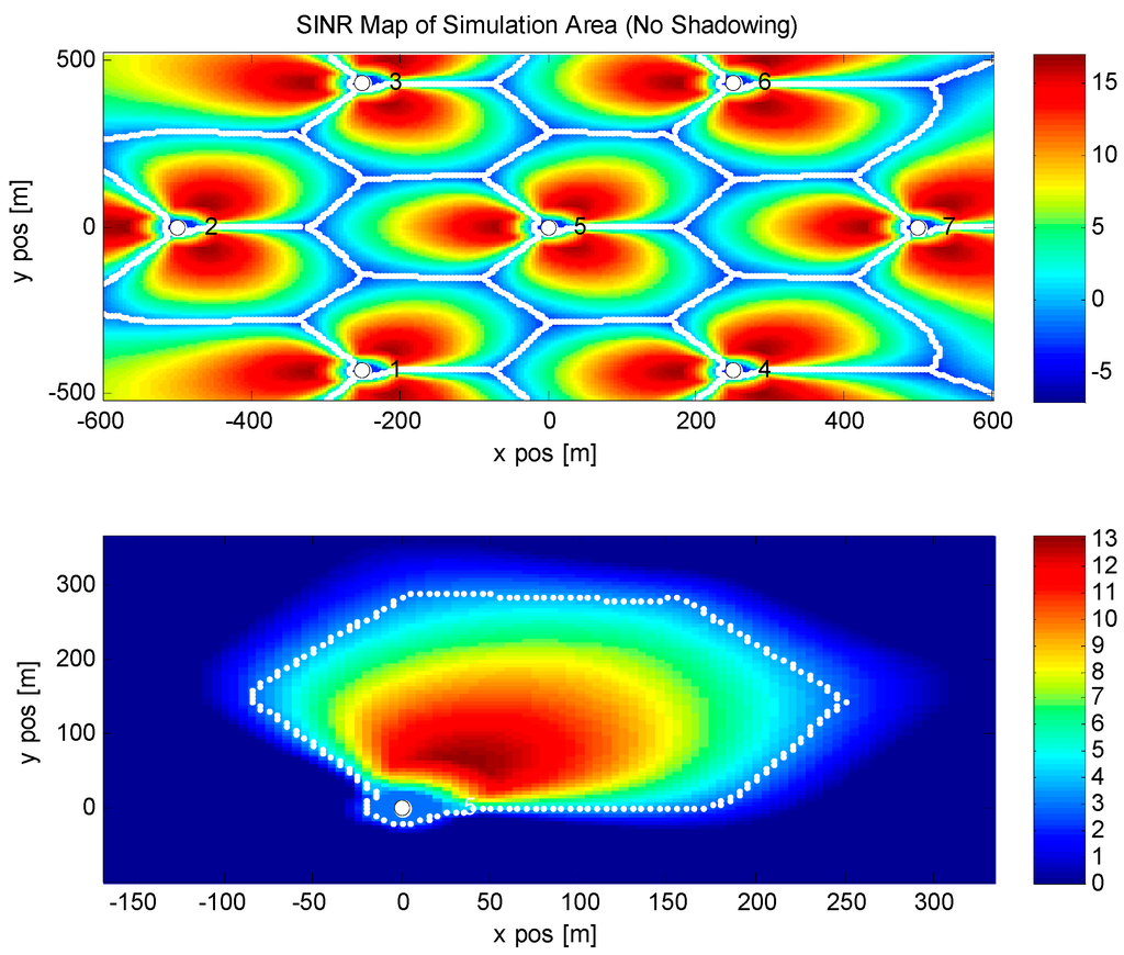 In Figure 4 and Figure 5, a SINR map of the simulated area is given. We simulate a 7-base stations scenario which is commonly used in LTE-related simulations. Figure 4 is the result of SINR map without shadow fading, the x-axis and the y-axis are the distance in meters, different colors indicate the strength of the received signal. Blue means the received SINR is low and red means the received SINR is high. It is obvious that when the position of a user is close to a base station, the condition of the received signal is perfect and it is suitable for cooperation. When users are located at the edge of the cell, it is difficult to receive satisfactory signals, so the cooperation is not valid at such a position. In Figure 5, shadow fading is considered in the same scenario. Different from the SINR map above, the shadowing map adds the influence of trees, buildings and other sources, which will be the reflectors to the channels. Such scattering will affect the transmission of wireless signals in a line of sight (LOS) scenario, that is why even when a user is close to the base station the performance is poor.