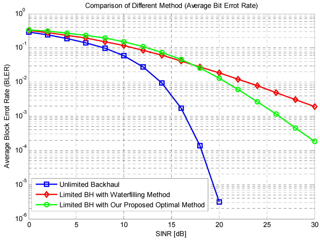 In Figure 7, the result of SINR (Signal to Interference plus Noise Ratio) versus average throughput is given. The x-axis is the system SINR in dB and the y-axis is the system average throughput in Mbps. Different colors and legends mean different methods. The blue curve is the performance without the constraint of system backhaul, the red one is the performance using water filling method given in [31] and the green one is our proposed method. First of all, the unlimited backhaul cooperative mode reaches the top when the SINR is 10 dB, and water filling method also reaches its bottleneck of 9.5 Mbps at the same SINR value. It is clear that the capacity constraint backhaul greatly affects the system performance, and there is about 50% performance loss. When adopting our proposed method, the maximum throughput could be achieved through good signal strength, when the SINR is about 16 dB, the system could also reach the top performance; this is because the power makes up for the loss of limited bandwidth, which is also proved in the Shannon formula, but when the SINR is low, our proposed method does not work well, it is because the resource allocation scheme requires a minimum transmission speed as is given in the proof, so in this figure, we can conclude that our proposed method could fix the disadvantage of limited backhaul bandwidth and maintain satisfied performance through our optimal resource allocation in backhaul link. The performance of BLER (Block Error Rate) will be given in Figure 8.