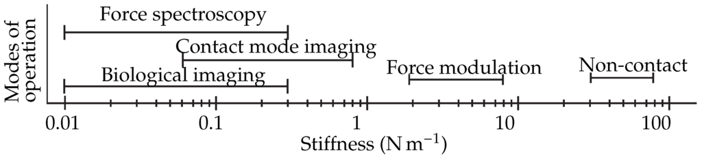 The range of stiffness for the AFM cantilever for different imaging modes.