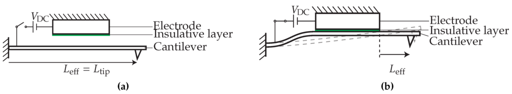 The change in stiffness is achieved by reducing the effective length of the cantilever. This is done by placing a parallel electrode close to the cantilever and applying a bias voltage between the cantilever and this electrode as shown in Figure 2. The cantilever pulls-in to the electrode (dashed line). The insulator ensures no electrical contact between the cantilever and electrode. When the voltage is further increased, the cantilever will end up in the final clamped state (solid line). The cantilever is clamped to the electrode due to the electrostatic force. The change in effective length of the cantilever results in a change in stiffness. The stiffness of a cantilever beam is governed by the following equation: