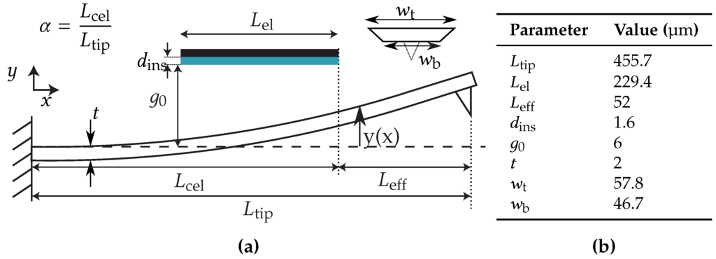 The pull-in voltage () is found when is at its maximum. For voltages higher than , the system is unstable. The geometric parameters are shown in Figure 3a. is the effective Young’s modulus ( with E and ν the Young’s modulus and Poisson’s ratio respectively), I the second moment of inertia, the initial distance between the electrode and cantilever, and are the dielectric permittivity in air and insulator respectively. The effective width of the cantilever compensates for fringe field effects [17]: