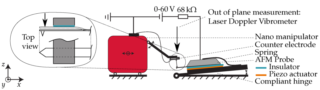 An experimental setup was developed to prove the change in stiffness of the cantilever. The setup is shown in Figure 4. A commercially available silicon probe was used for this experiment (BudgetSensors ContAl k = 0.2 N/m, , ). It was mounted on top of a stack of a prototyping PCB, a piezo actuator, an insulative 125 µm thick sheet of polydimethylsiloxane (PDMS) from Shielding Solutions. A small spring was used to apply a clamping force on this stack. A remotely controlled robotic nanomanipulator (miBot) from Imina Technologies was used to position the electrode relative to the cantilever. This nanomanipulator can move in-plane and has an arm that moves out-of-plane. This arm determined the gap between the electrode and the cantilever. The electrode was made by laser cutting of a 150 µm thick sheet of spring steel. It was covered by a 1.6 µm layer of photo resist (AZ9260), with a dielectric constant of 4.03 and dielectric strength of 694 V/µm. It was important that this layer had a high dielectric strength, such that the insulative properties remain intact when the cantilever was pulled-in. The electrode and cantilever were made parallel (confirmed from the optical image) by controlling the angle of the cantilever with a compliant hinge. In order to apply the bias voltage between the cantilever and electrode, electrical connections were made to connect the system to a voltage source of maximum 60 V. To protect the system in case of a short circuit, a current limiting resistor of 68 was added in series. The setup was placed in a Polytec MSA-400 laser Doppler vibrometer to measure the resonance frequency and modes of the cantilever. The piezo actuator under the cantilever was used to actuate the system, using a frequency sweep. The vibrometer measured the out of plane (z-axis in Figure 4) response of the cantilever for a varying electrode position. The fundamental resonance frequency was compared to the theoretical value. The built-in camera of the vibrometer was used to visualize the cantilever from the side, using a right angle mirror (N-BK7, Edmund optics). This enabled us to measure the effective cantilever length. More details of this experimental setup are given in the supplementary material.