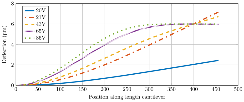 The shape of the cantilever is shown as a function of the position along the length of the cantilever. This is shown for a varying voltage.