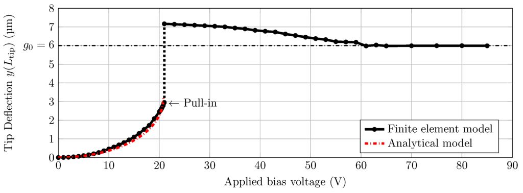 The shape of the cantilever for a varying voltage is shown in Figure 5. In Figure 6 the deflection at the tip in steady state is shown as a function of the bias voltage. The simulation results are compared with the analytical model. The pull-in voltage for the parameters used (Figure 3a) was found to be 21 V. When the voltage was further increased to 65 V, the system was in the clamped state. More details of the models and obtained results are given in the supplementary material.
