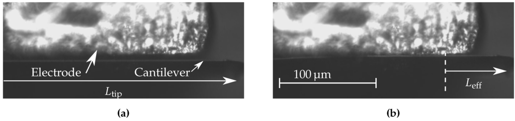 Side view of the electrode and the cantilever obtained with an optical microscope. (a) before stiffness adjustment; (b) after stiffness adjustment. The clamped side of the cantilever is located at the left (not shown). These positions correspond to the ones shown in Figure 2.