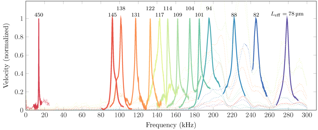 The fundamental resonance frequency obtained for different adjusted lengths of the cantilever. The electrode position is varied and the cantilever is pulled-in for these positions, reducing its effective length. The cantilever is actuated with a frequency sweep and the response is shown in this figure. The numbers above the peaks indicate the effective length of the cantilever (in µm). Only the resonance peaks of the cantilever are shown in a solid line, while the rest of the bandwidth is plotted as a dotted line for clarity. All the measurements were made at an applied voltage of 60 V. More data and a detailed discussion is given in the supplementary material.