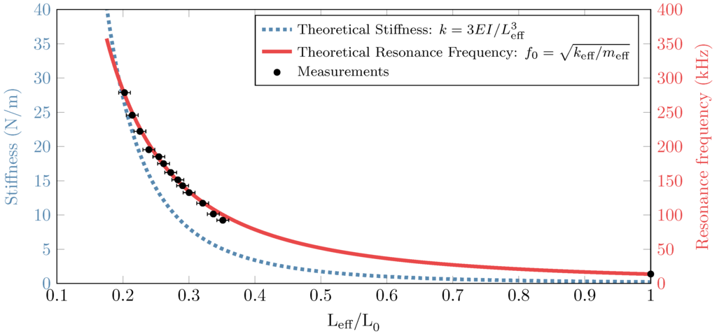 where E is the Young’s modulus, I the second moment of inertia and the effective length. So if the effective length is reduced, the stiffness will increase. For example; in order to increase the stiffness one order of magnitude, the effective length should decrease times. Note that for accurate measurement of stiffness, Sader method is recommended which is based on thermal resonance frequency spectrum [14,15].