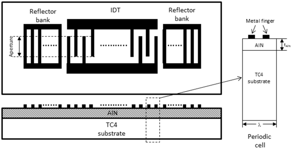 In this work, we designed a one-port SAW resonator, which consists of an interdigital transducer (IDT) and two reflector banks. The IDT contained 101 equal-interval-finger electrodes, and each reflector bank contained 400 short-circuited gratings. The finger width of the IDTs was 6 μm, yielding an acoustic wavelength (λ) of 24 μm. The acoustic aperture W was 100λ. The IDT was patterned on the AlN films, which were deposited on a TC4 (titanium alloy, known as Ti-6Al-4V) alloy substrate. The schematic illustration of the one-port SAW resonator is presented in Figure 1. Because the IDTs are periodic in nature, one period cell of the IDT electrode is sufficient to model the SAW resonator as a whole. The height of the simulation cell only extends a few wavelengths down to the bottom of the substrate, because the SAW has almost died out at the lower boundary. Since the length of the electrode is far larger than its width, edge effects of the electrodes can be ignored, and the model geometry can be reduced to a periodic cell [5]. The geometry of the SAW structure used in the simulation is shown in Figure 1.