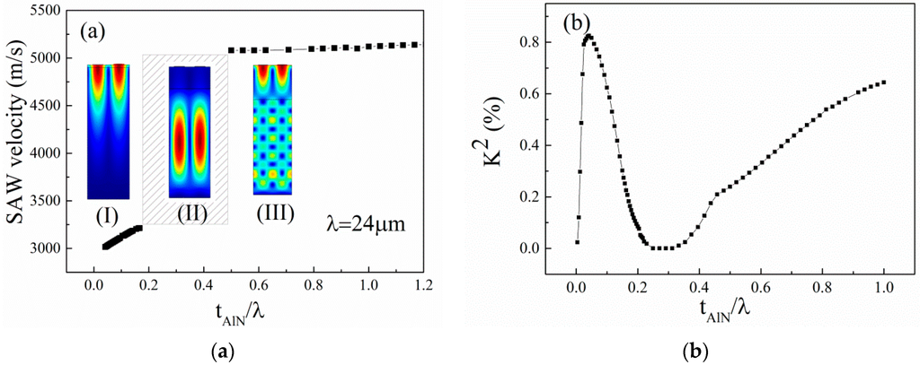 where the v0 and vm are phase velocities, when the electrical boundary conditions of the AlN surface are assumed to be electrically free and shorted, respectively. The simulated k2 is shown in Figure 2b.