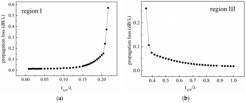 where ω is the angular frequency, Qi is the complex charge in the electrodes, and Vi is the potential. The calculated propagation loss in regions (I) and (III) is presented in Figure 3.