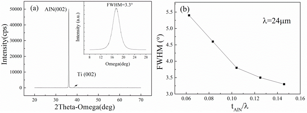 Typical XRD-spectra of the AlN films on the TC4 substrate is presented in Figure 5a. The thickness of the AlN film is 3.5 μm, corresponding to tAlN/λ of 0.1458. The FWHM value of the X-ray rocking curve for the (002) oriented thin AlN film is only 3.3°, which indicates that the AlN film is highly c-axis oriented on the TC4 substrate. The FWHM values of the AlN film with different thicknesses are shown in Figure 5b. It can be found that the FWHM value of the AlN films decreases with the increase of tAlN/λ.