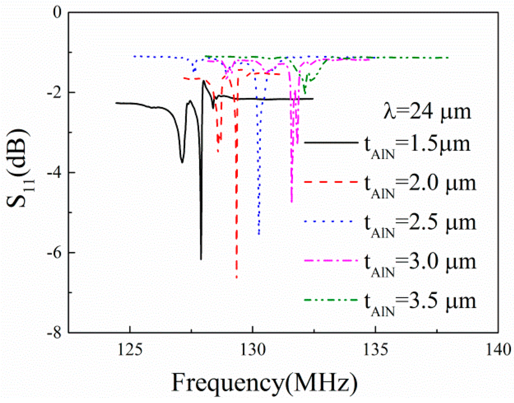 Figure 6 shows the measured frequency responses of the one-port SAW resonators on the AlN/TC4 structures. The thickness of the AlN films tAlN varies from 1.5 μm to 3.5 μm with a step of 0.5 μm. We can observe clear resonance peaks of each SAW device. The resonance frequency increases from 127.90 MHz to 132.09 MHz when the AlN film thickness increases from 1.5 μm to 3.5 μm. Weak spurious peaks occur near the Rayleigh-mode resonance peaks. It is probable that this is due to the defects of the surface electrodes [15].