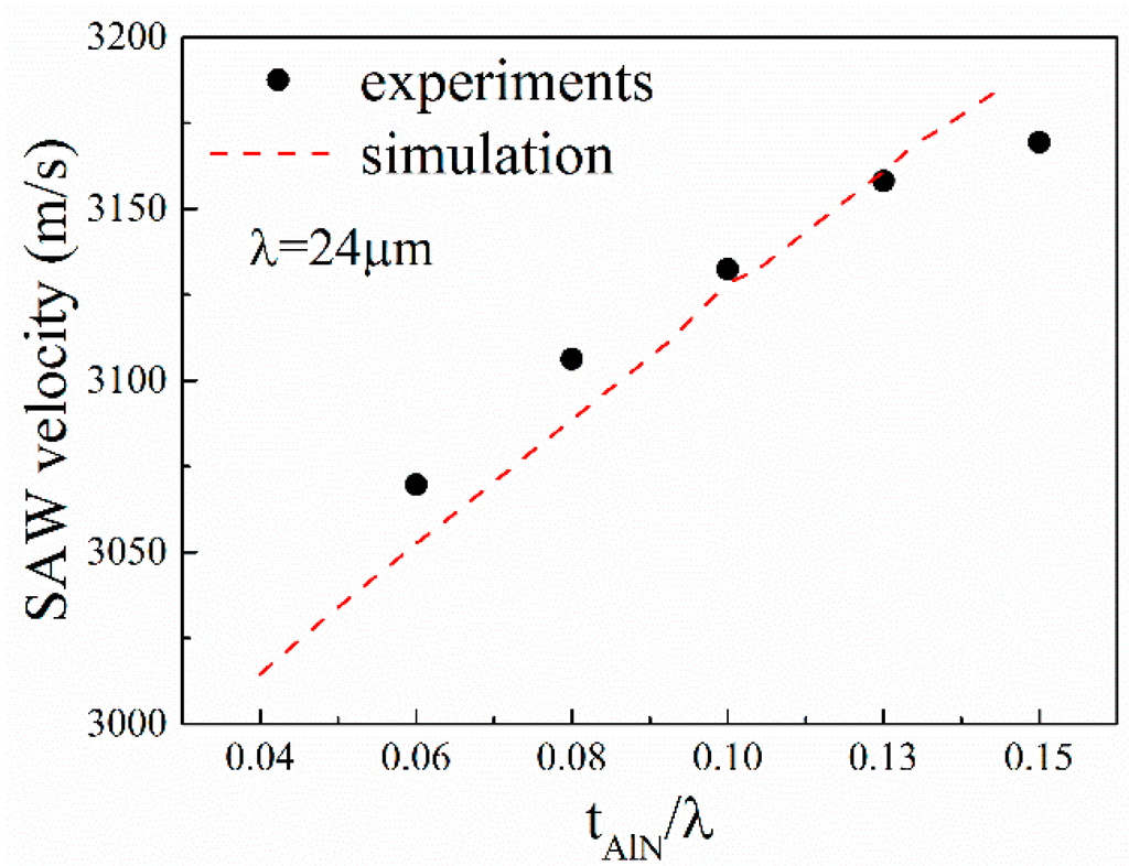 From Figure 6, it can be seen that the resonance frequency of the SAW device shifts from low frequency to high frequency with the increase in AlN film thickness. Thus, it can be expected that the surface acoustic wave velocity increases with the increase in AlN film thickness. The calculated SAW velocities with Equation (1) are shown in Figure 7. The simulation results are also presented in Figure 7 for comparison. The SAW velocity is in the range 3060–3170 m/s. One can observe good agreement between the experimental and simulated results.