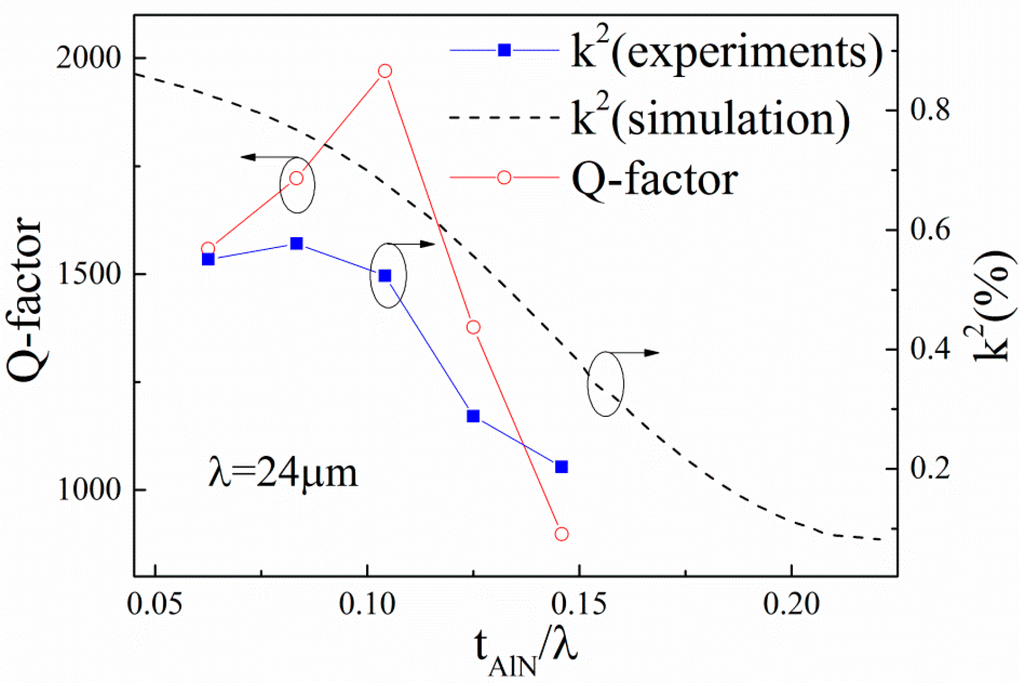 Figure 8 shows the dependence of the Q-factor and k2 on the normalized thickness of AlN film. In Figure 8, the maximum k2 of 0.57% and maximum Q-factor of 1920 are achieved in the AlN/TC4 structure when the tAlN/λ is 0.0833 and 0.1042, respectively. We can find that the simulated k2 decreases monotonously with the increase of tAlN/λ. However, the measured k2 increases firstly and then decreases with the increase of tAlN/λ. We think this is because the k2 is dependent not only on the thickness of AlN films but also on the quality of the AlN films. The FWHM of the AlN film decreased rapidly with the increase of tAlN when the AlN film was thinner than 2 μm, as shown in Figure 5b, which shows that the k2 would increase with the increase of tAlN because the smaller the FWHM, the larger the k2 [18]. When the tAlN/λ is greater than 0.1, the k2 decreases with the tAlN, which indicates that the thickness effect determines the k2 and has a negative effect on the performance of the devices. For the same reason, we can find that the dependency of the Q-factor on the tAlN/λ is similar to that of k2.