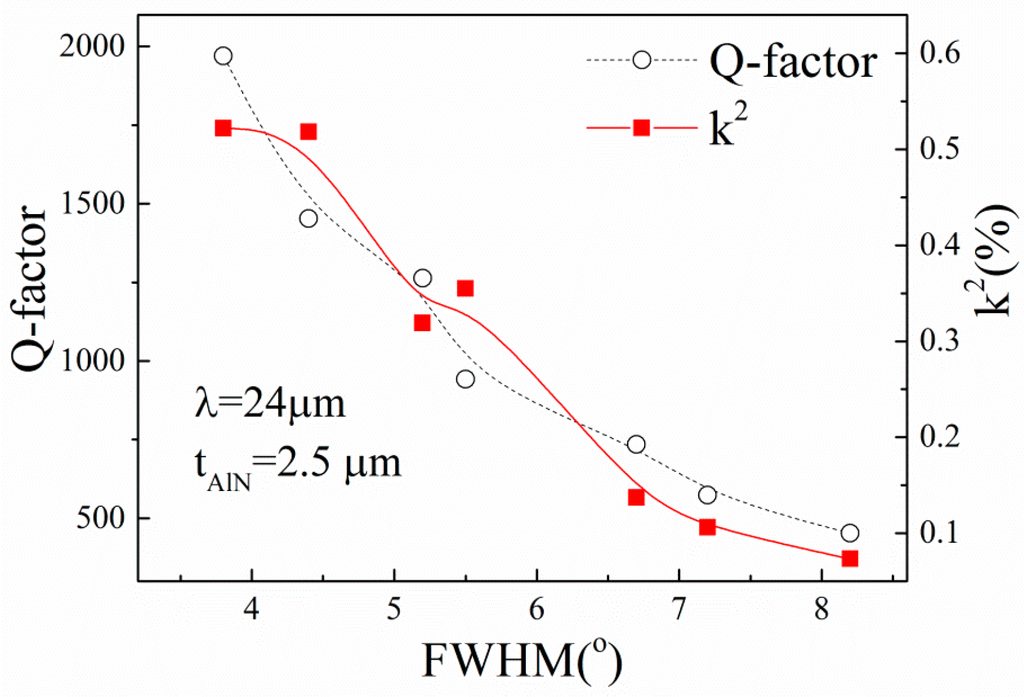 From Figure 9, it can be found that the Q-factor and k2 of the SAW devices are strongly dependent on the FWHM of the AlN films. Both Q-factor and k2 decrease with the increase of the FWHM of the AlN film. The result is agreement with [19]. The dependency of k2 on FWHM can be explained by the piezoelectricity of the AlN films, which strongly depends on the orientation of the crystalline grain. In general, a small k2 of the substrates would increase the loss of acoustic energy and lead to a small Q-factor of the realized devices when the devices are fabricated with the same design [20]. This also explained why the performance of the devices, as shown in Figure 8, increases with the increase of tAlN/λ when tAlN/λ < 0.1.