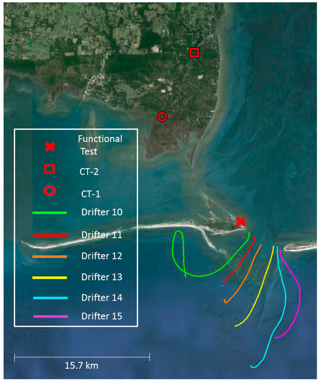 It should be noted that, while temperature and salinity measurements are reported for this deployment in Figure 7, only minimal data validation was conducted as the purpose of this release was the refinement of the deployment and recovery logistics. However, a single temperature and salinity measurement was taken with a YSI 2030pro at the time of recovery for drifters 11–15, and the results are reported in Table 2. A comparison between the final drifter readings and the YSI 2030 indicate that drifters 13 and 14 reported salinity measurements outside of acceptable tolerance, while drifter 15 reported erroneous temperature measurements. Drifter 15’s issue was traced back to incorrect calibration offset entered in the programming code and not associated with instrument malfunction. Over the course of the deployments, the drifters exited the system on the ebb tide causing increases in the salinity as saltier Gulf of Mexico water is entrained into the outflow. Similarly, the temperatures increase with distance from the mouth, consistent with offshore conditions being slower in response to the seasonal cooling due to the larger water column.