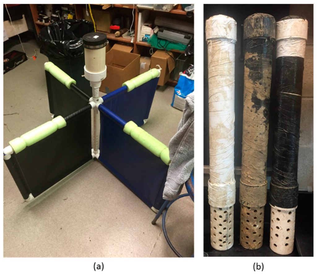 The drifter application was developed to be deployed in a lagrangian drifter following the industry accepted 40:1 Drag Area Ratio (DAR) described by [19] Figure 4a. The drifter frames were constructed from 2.54 cm Polyvinal chloride (PVC) tubes and consisted of a collapsible drogue, underwater sensor housing, and waterproof compartment to house the sonde electronics.