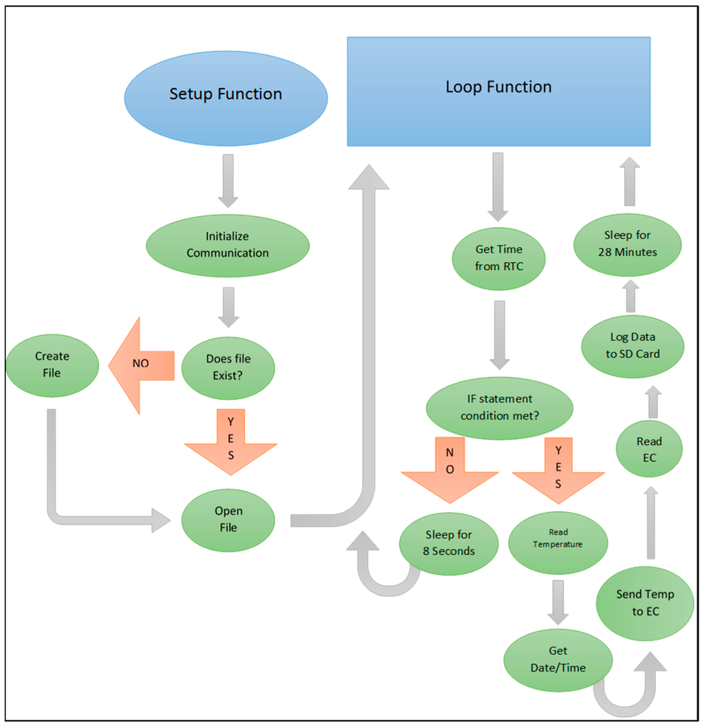 The code for the drifter application was written with the Arduino integrated development environment (IDE) software, which was based on the C++ language. The IDE was downloaded for free from the Arduino website. Source code used for the drifter and moored applications of the sonde can be found in Supplementary Materials. The code for the drifter application was compiled from the open source support available online, and followed the logic depicted in Figure 3. Sampling interval for the drifter application was set to 60 s, but could be user specified to a 1 ms interval. GPS data were received, filtered for the most recent NMEA sentence, then parsed into integers and saved to the microSD card as Latitude, Longitude, Speed, Number of Satellites Locked, Date, and Time. Temperature and GPS readings were transferred through serial channels at 9600 baud, while conductivity used I2C communications with the EZO-EC which had a default address of 100. The temperature and conductivity probes were supplied with 5 volts, which was reduced by the interaction of the probe with the environment, the resulting voltage change represented the raw parameter measurement. The standard resolution of the Arduino Mega 8 bit processor was 1023 intervals, which when applied to the range of the temperature sensor (−20 to 133 °C) resulted in approximately 0.25 °C. Resolution could be increased with the addition of an amplifier (i.e., INA125P), but was not necessary for this project. However, the EZO-EC performed the function of an amplifier, and provided a conductivity resolution of 0.01 µS over a range of 0.07–99.99 µS with the setup described. In addition to amplification, the EZO-EC temperature compensated and calculated salinity, total dissolved solids, conductivity and specific gravity. In between the sampling interval, the EZO-EC was put into a quiescent state to minimize power consumption. The data were saved as a CSV file on the microSD card. If power was removed or lost, the new data were appended to the existing file, if present, when power was re-supplied. A new file was created if none existed on the microSD card.