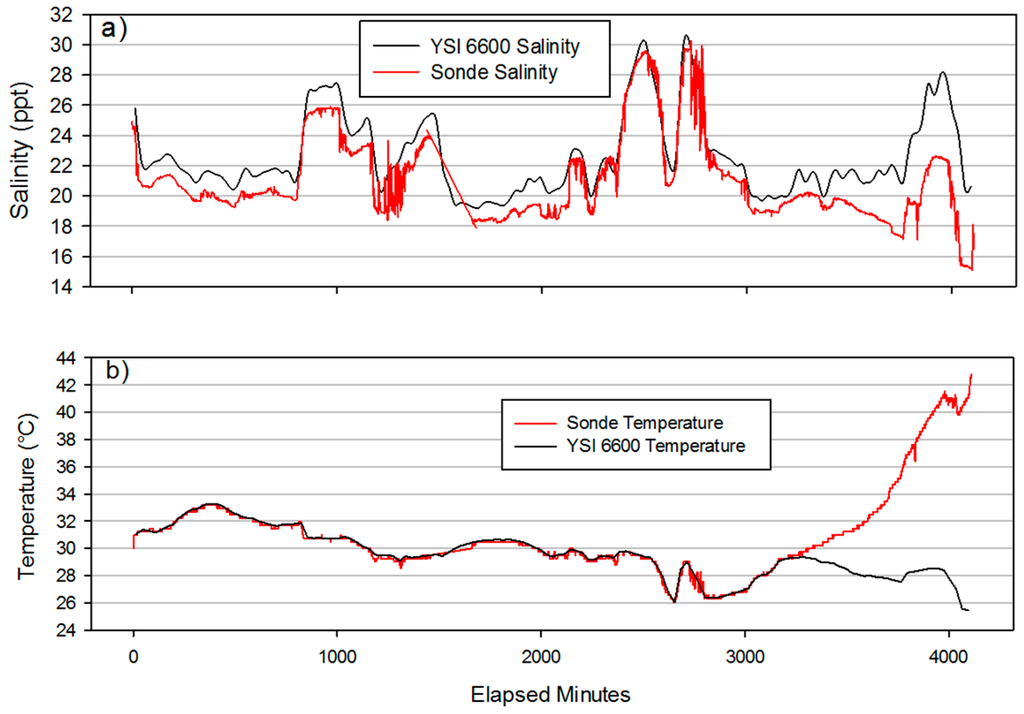 In general, the functional testing indicated that the performance of the sonde was adequate for the expected environmental conditions and the level of accuracy needed. Conductivity measurements were consistently lower than those recorded by the YSI 6600 during functional testing. There are physical reasons that could explain the difference between the two instrument records. For example the physical separation (approximately 0.5 m) between the instrument sensors may have caused the experimental sonde to have the observed lower salinity bias. Mobile Bay is a highly stratified environment that commonly experiences vertical gradients in salinity associated with freshwater discharge that are modulated by wind driven mixing events [21,22]. However, it is unclear if this is in fact the case as vertical stratification is dominated primarily by thermal density changes in the summer [22], and so a temperature offset would be expected to accompany the observed salinity offset.